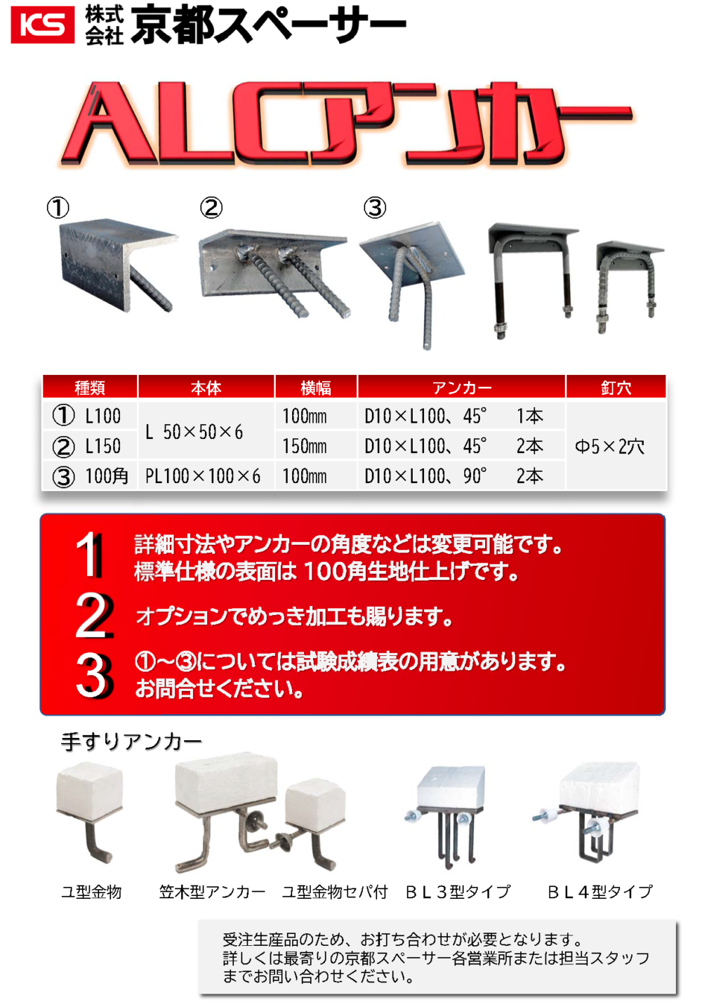 京都スペーサーの溶接用 埋め込み金物 「ALCアンカー」は標準仕様の3種類のほか、現場設計に応じた鋼材規格変更、寸法変更など自由設計が可能!