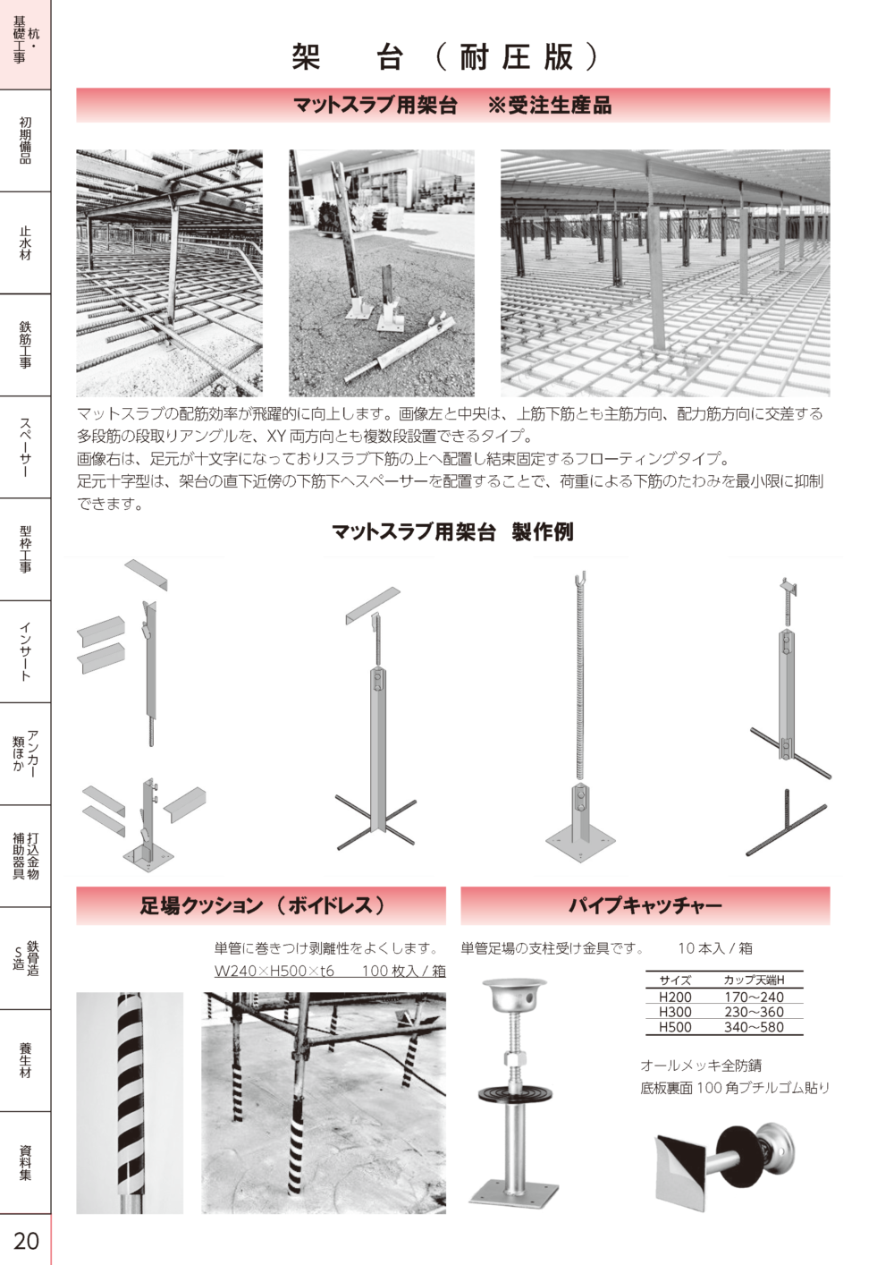 京都スペーサーの「マットスラブ用 架台」は、マットスラブの配筋を行う際に使用する埋設型の配筋スタンドです。