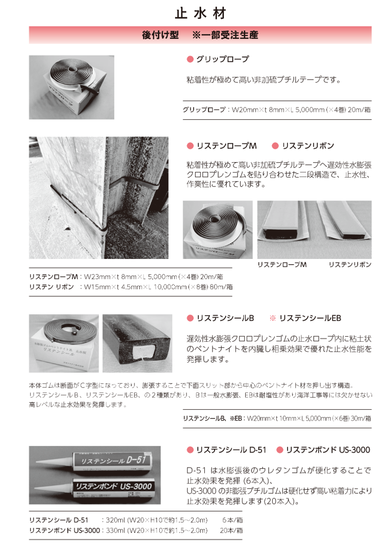 京都スペーサーが販売する日本リステン株式会社の液状止水材には、主成分や止水方法が全く異なる2種のコーキング型止水材があります。